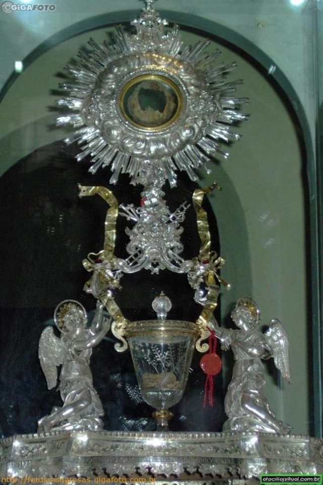 فبين يدي هذا الراهب، تحولت القربانة الى لحم و الخمر الى دم. وظهر الدم بشكل خمس جلطات غير متعادلة.