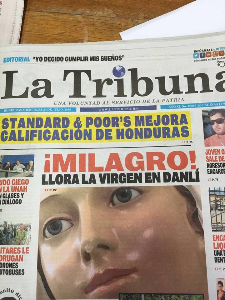 وقد قال الكاهن الشهير خوان أنجل لوبيز أنّ تمثال السيّدة العذراء في هندوراس بدأ يبكي منذ يوم الثلاثاء 19/7 في كنيسة القديس يعقوب التابعة للجامعة كاثوليكية في دانلي البراسيو، في الهندوراس. وهو اليوم الذي يسبق بداية تساعية القديس يعقوب، شفيع مديوغورييه.